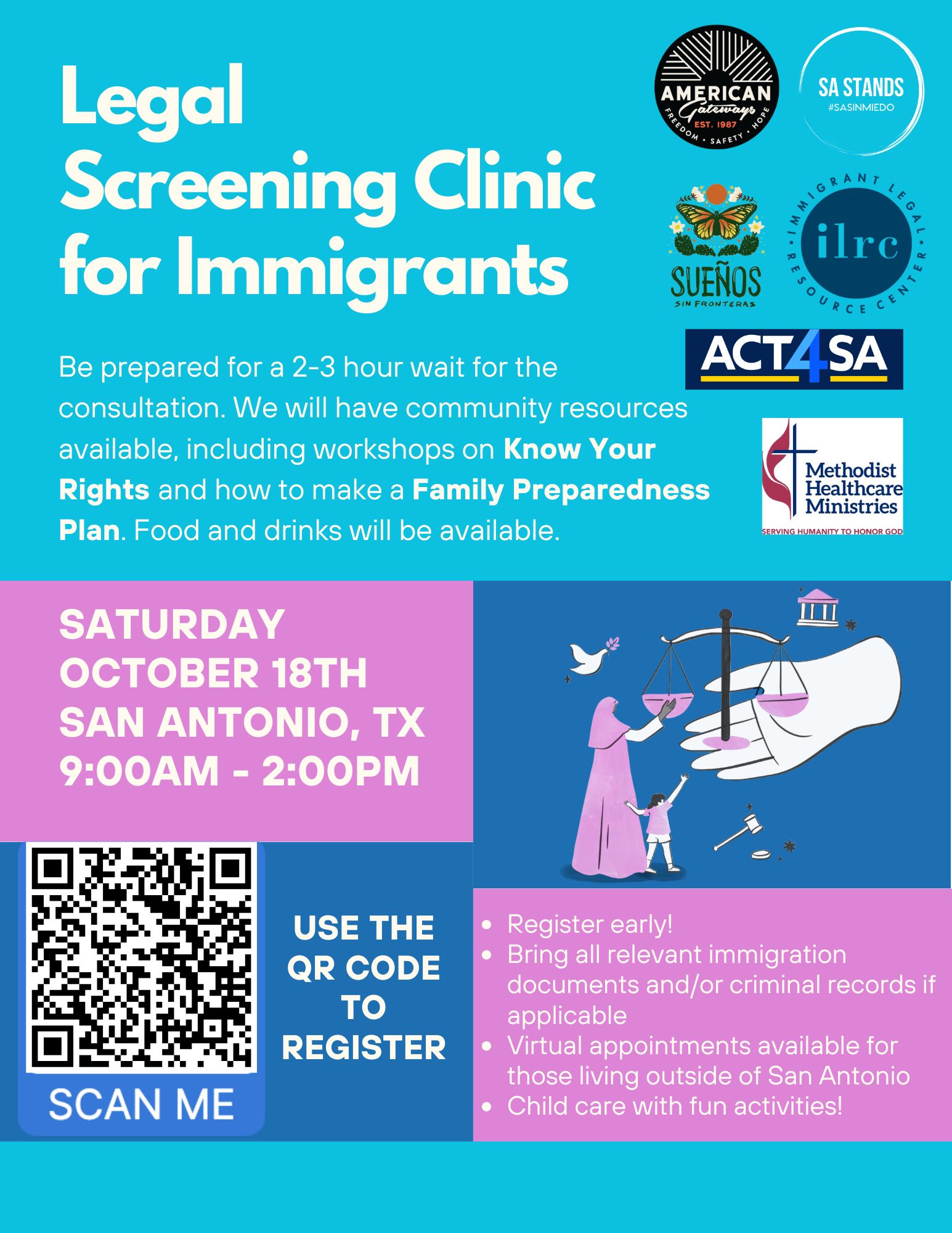 Legal Screening Clinic for Immigrants on October 18th from 9am - 2pm. View more information here.